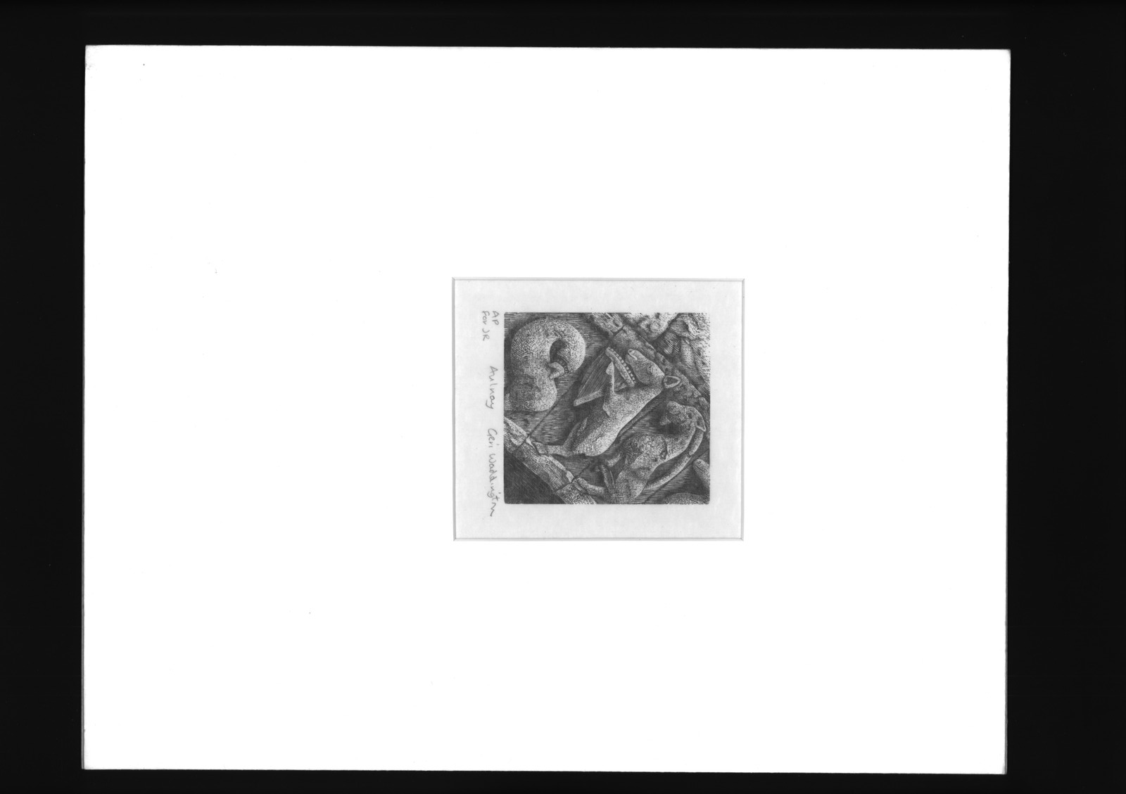 This is a black and white wood cut print. By: Ceri Waddington