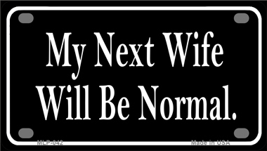 My Next Wife Novelty Mini Metal License Plate Tag. 2.2" x 4" high gloss novelty mini metal license plate tag. Made of the highest quality aluminum for a weather resistant finish. It is lightweight and durable. Pre-drilled holes for quick and easy mounting on any vehicle, or add a ribbon, wire or string to instantly turn this license plate into a sign and display it on a wall or door. Individually shrink-wrapped and proudly made in the USA.