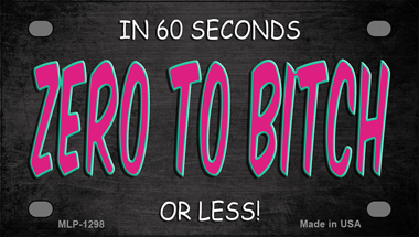 Zero To Bitch Novelty Mini Metal License Plate Tag. 2.2" x 4" high gloss novelty mini metal license plate tag. Made of the highest quality aluminum for a weather resistant finish. It is lightweight and durable. Pre-drilled holes for quick and easy mounting on any vehicle, or add a ribbon, wire or string to instantly turn this license plate into a sign and display it on a wall or door. Individually shrink-wrapped and proudly made in the USA.