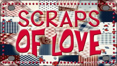 Scraps Of Love Novelty Mini Metal License Plate Tag. 2.2" x 4" high gloss novelty mini metal license plate tag. Made of the highest quality aluminum for a weather resistant finish. It is lightweight and durable. Pre-drilled holes for quick and easy mounting on any vehicle, or add a ribbon, wire or string to instantly turn this license plate into a sign and display it on a wall or door. Individually shrink-wrapped and proudly made in the USA.