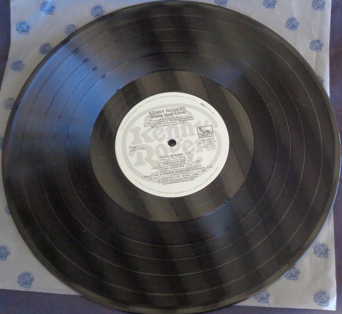 Offered here is this nice vintage full length LP Vinyl Record, Kenny Rogers, Share Your Love. The record is a Liberty record and plays at 33.3 speed. It is in good condition but does have some light scratches on it. I do not own a record player, so the record has not been tested. It is a 12” vinyl record. It would be a wonderful addition to any vintage vinyl collection. It features the songs;