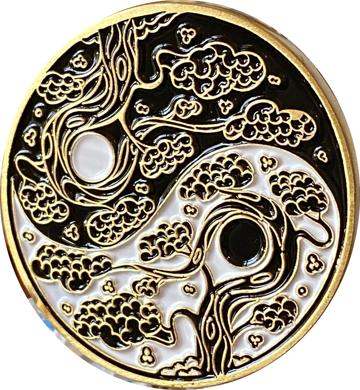 Sakura tree coin in the shape of the Yin Yang symbol. Cherry flower blossom, botanical art hand-drawn with ink in traditional Japanese painting style. Back of the medallion has the Serenity Prayer. Size is 34x2mm Yin Yang is Black and White In Color. Great spiritual gift especially popular with members of recovery or sobriety programs like AA or NA but the coin references none of these programs.