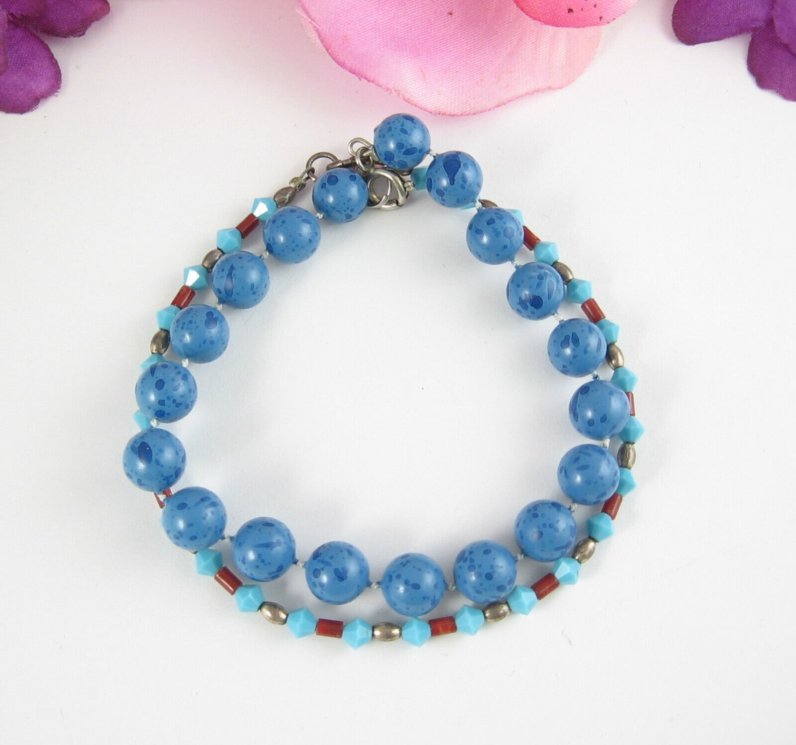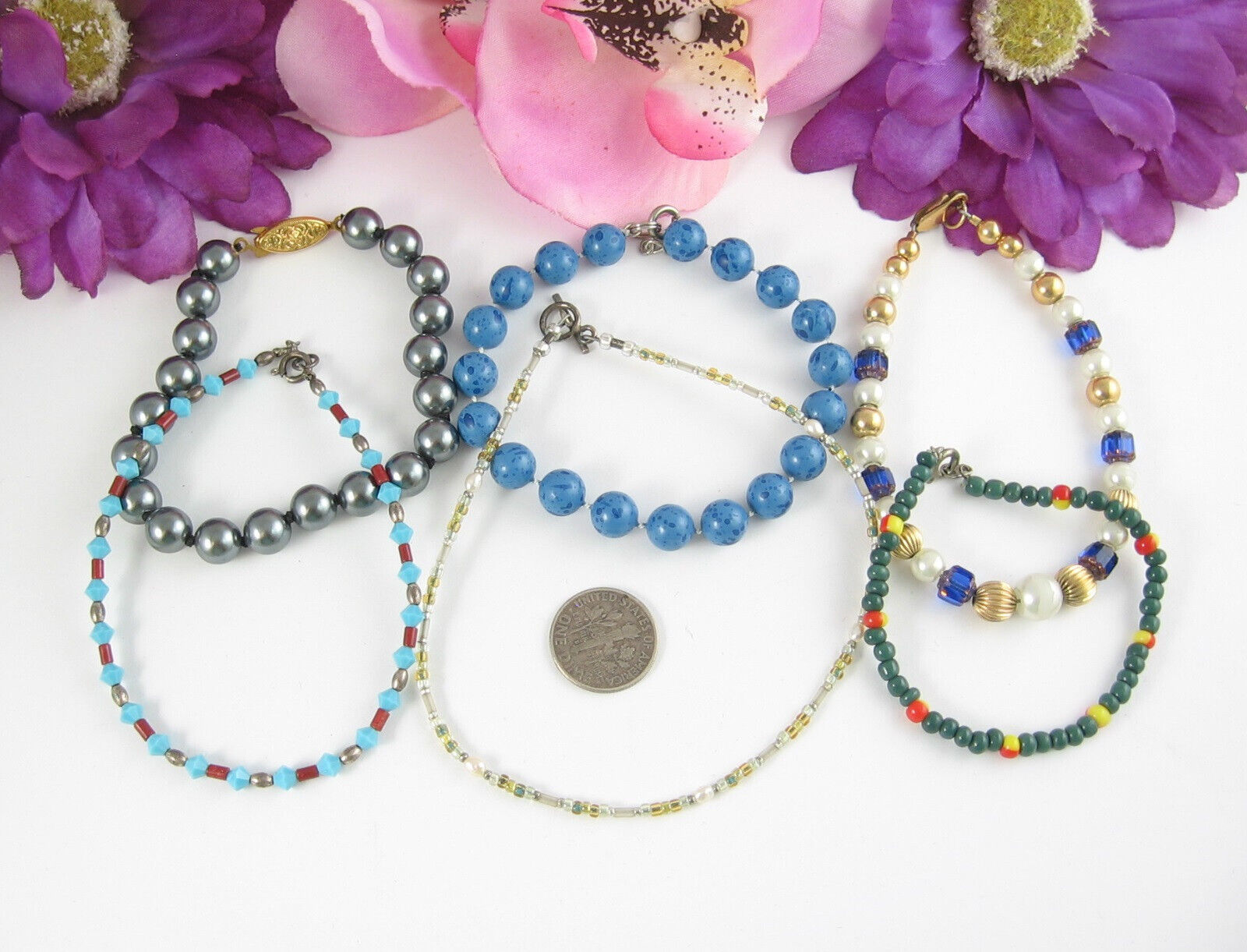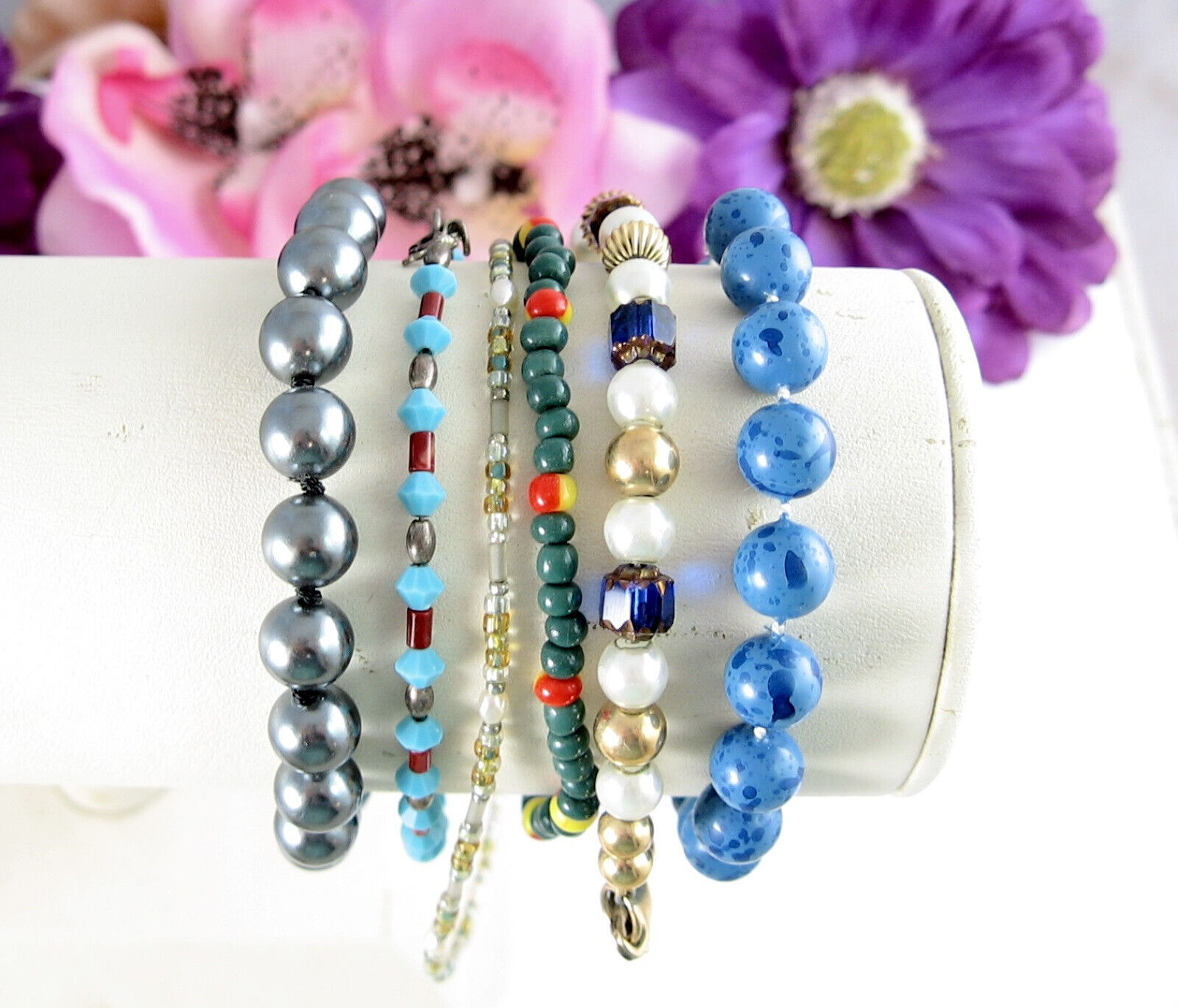 6 Vintage BEADED BRACELETS Clasps Glass Plastic Blue Cobalt Greens Gray Beads