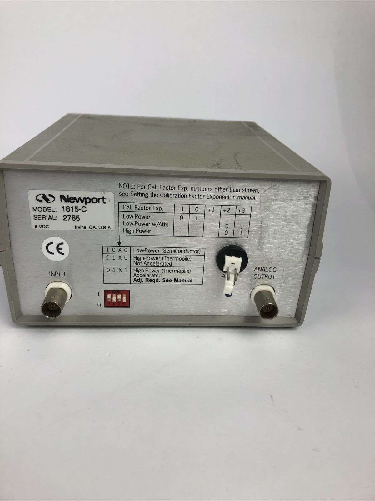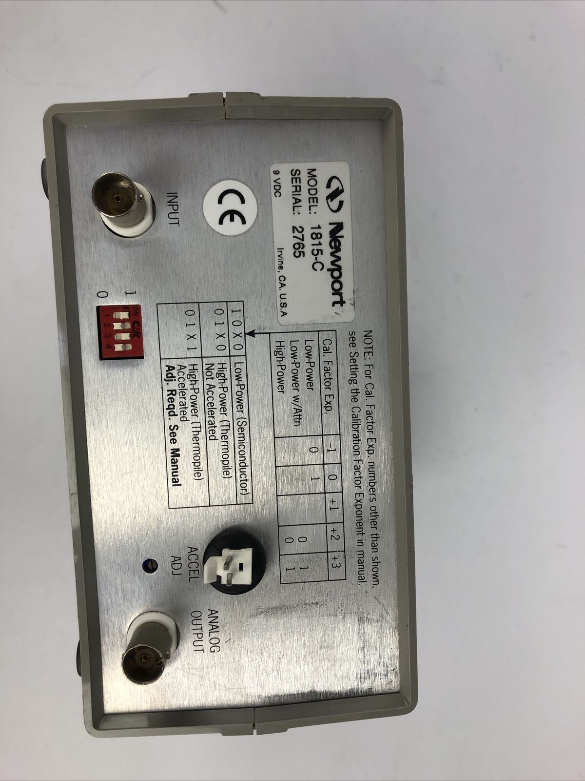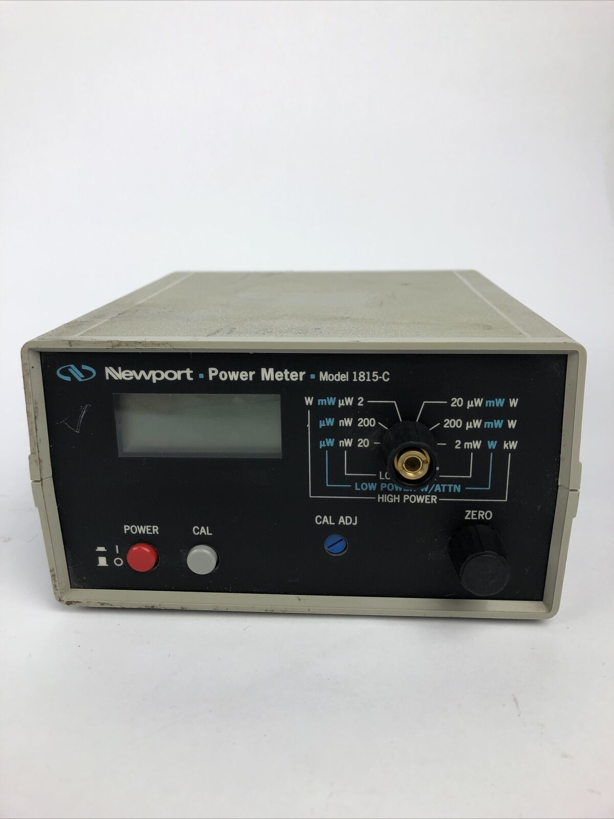 Newport 1815-C Optical Power Meter - Fast Free Shipping Via FedEx Ground. Condition is "Used". Shipped with FedEx Ground or FedEx Home Delivery. Features: ---Optical Measurement Capability ---Front Panel Range ---CAL Feature ---Compatible with Low-Power and High-Power Detectors The Newport Model 1815-C is an accurate low cost optical power meter that provides optical measurement capability from nanowatts to kilowatts. Front panel Range and ZERO functions facilitate use while a wavelength compensation CAL feature insures that NIST/NPL traceable measurements can be performed. Compatible with Newport's Low-Power and High-Power detector families, the Model 1815-C covers the majority of optical power measurement needs.