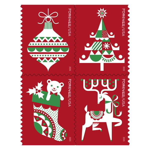 2020 55c Holiday Delights, Modern Christmas Graphics Scott 5526-29 Block of 4