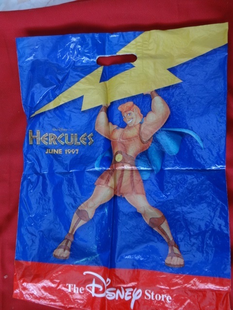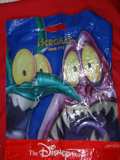 Plastic bag from the Disney Store, wrinkled from use.