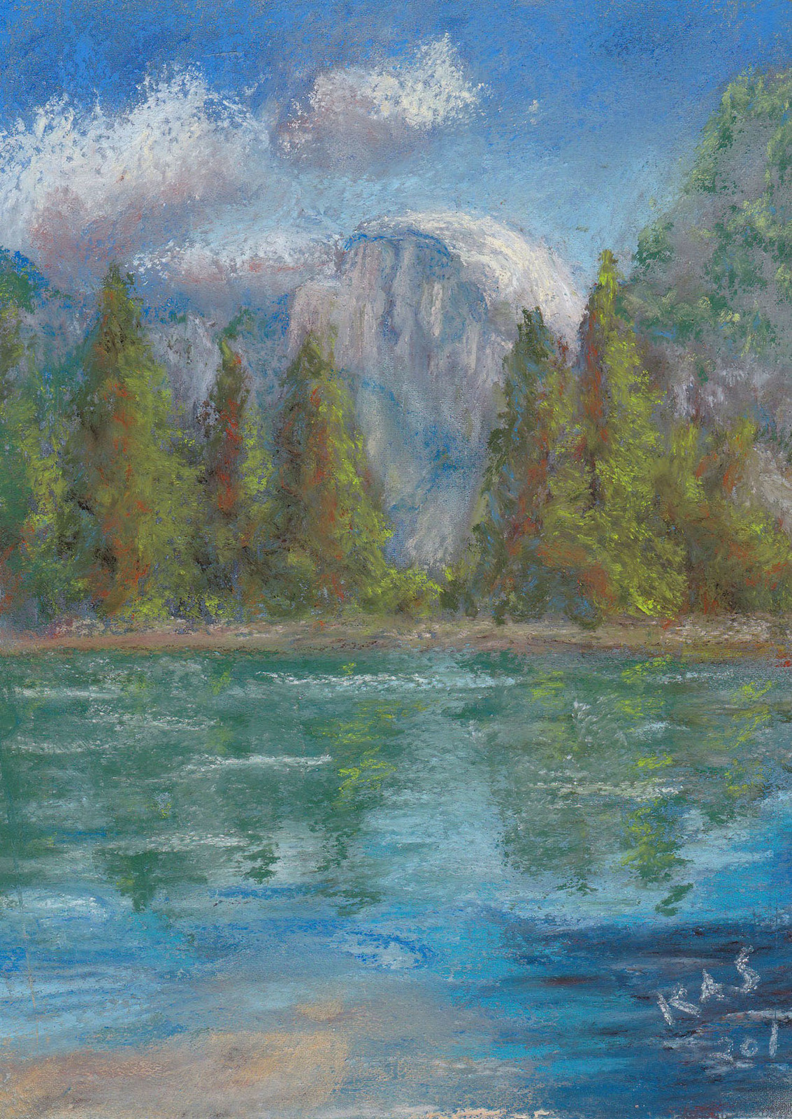 This is a 5"x7" pastel painting I did from a photograph I snapped on a trip my husband and I took with my father and sister to California. Yosemite National Park was one of our stops and it is a beautiful, awe inspiring place to visit. This pastel painting is of the famous Half Dome. Also, if you are not familiar with pastels, read on. The sticks are made of pure pigment with minimal binder and are an immediate, dry, and vibrant medium to paint with. They rarely loose that vibrancy if properly and carefully handled and framed behind glass.