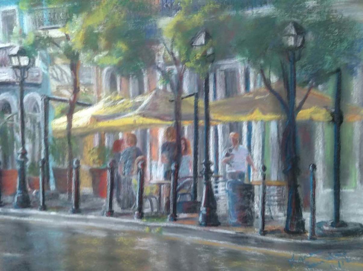 Recinto Sur is a street in Old San Juan in Puerto Rico. I painted this pastel from a photograph I took while my husband and I were visiting his mother there. If you look closely, the woman walking on the street is carrying a kitten. Perhaps she found it on the street and was taking it home. Also, if you are unfamiliar with pastels, read on. They are sticks make from pure pigment with minimal binder. They are an immediate, dry, and vibrant medium to paint with. If properly handled and framed, they rarely lose their vibrancy.