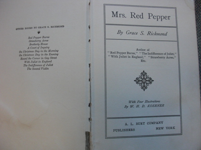 Grace Louise Smith Richmond (1866โ1959), American romance novelist created the Dr. R.P. Burns series. Her first short stories were published in various women's magazines including the Women's Home Companion, Ladies' Home Journal, and Everybody's Magazine as early as 1898. Richmond wrote 27 novels between 1905 and 1936. Red Pepper Burns was published in 1910. Like most of her strong-willed yet compassionate characters, R.P. Burns is a kind, old-souled country doctor who makes house calls. His fiery red hair and temper to match earned him his nickname Red Pepper, though he is still a charming and endearing gentleman. Mrs. Red Pepper (1913), Red Pepper's Patients (1917), and Red of the Redfields (1924) followed.