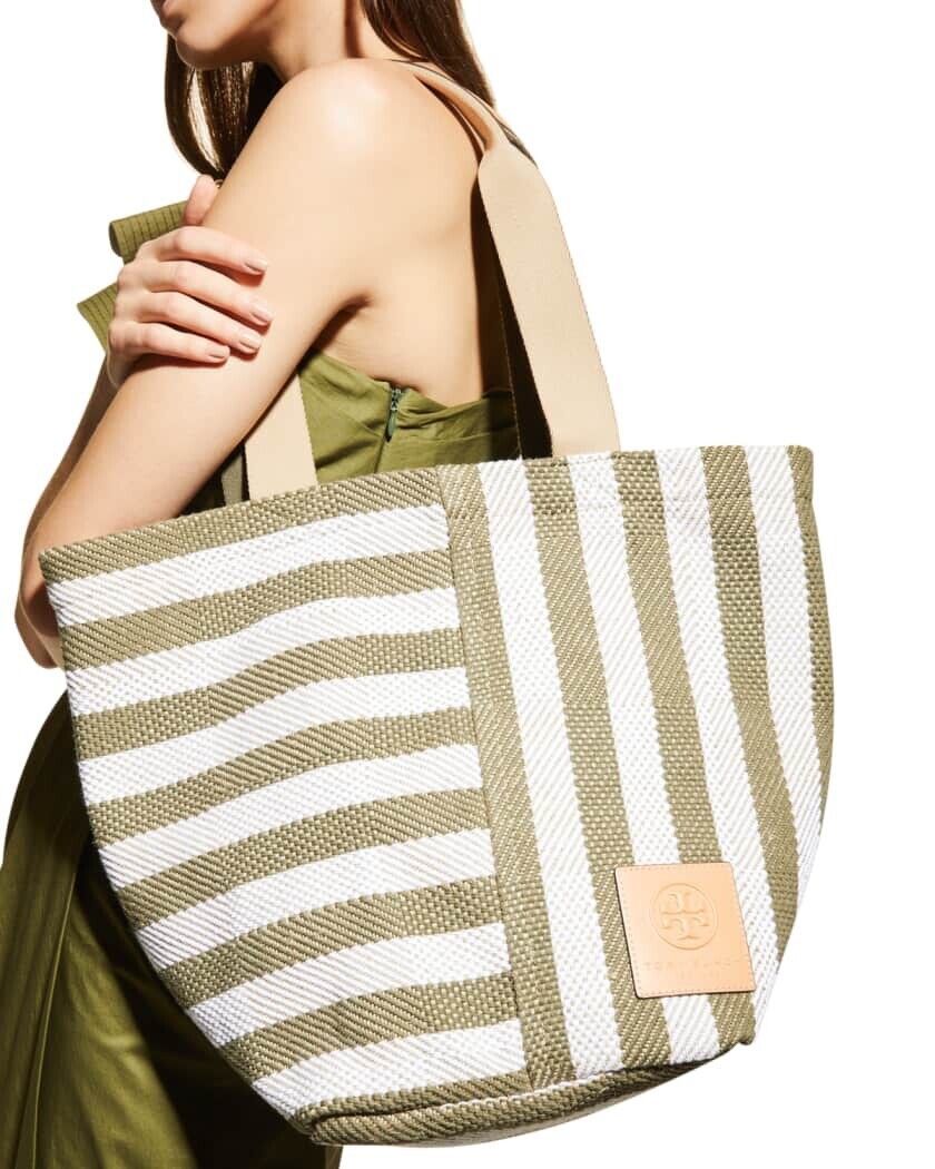 Tory Burch Gracie Striped Extra Large Canvas Tote Bag ~NWT~ Green Stripe