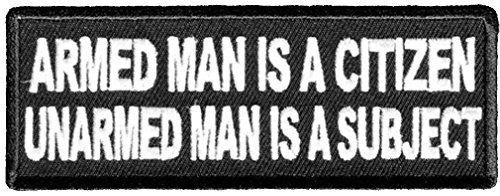 4" wide x 1 1/2" tall PATCH. Quality Embroidered ARMED MAN IS A CITIZEN UNARMED MAN IS A SUBJECT PATCH - Color - Durable with Iron On Backing. Great Detail and Stitching for a Jacket or Vest. Great Gift Idea for anyone. Veteran Owned and Operated Business - Retired Marine.