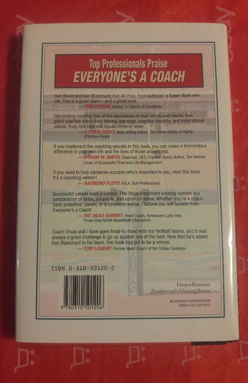 Here today is a good used condition book with dust jacket. Don Shula and Ken Blanchard. Everyone's A Coach. Book has some writing inside and some underlining. See photos and ask any questions. I do my best to describe all items. Sometimes I miss things.. Please Please ask questions. Thanks for bidding and good luck. Check out all my items for some great finds. Lots of cool stuff at my sales. I can combine shipping on most.