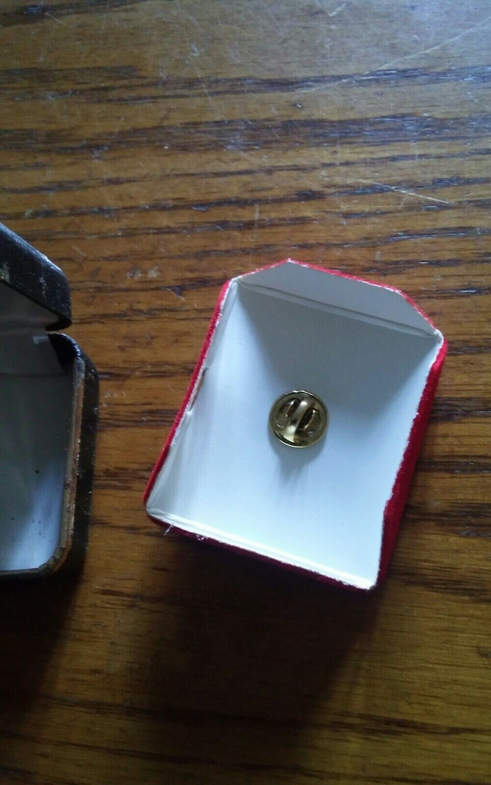 Here is a vintage pinback lapel pin or tie tack. By Hit. Marked on the back and in the original case.