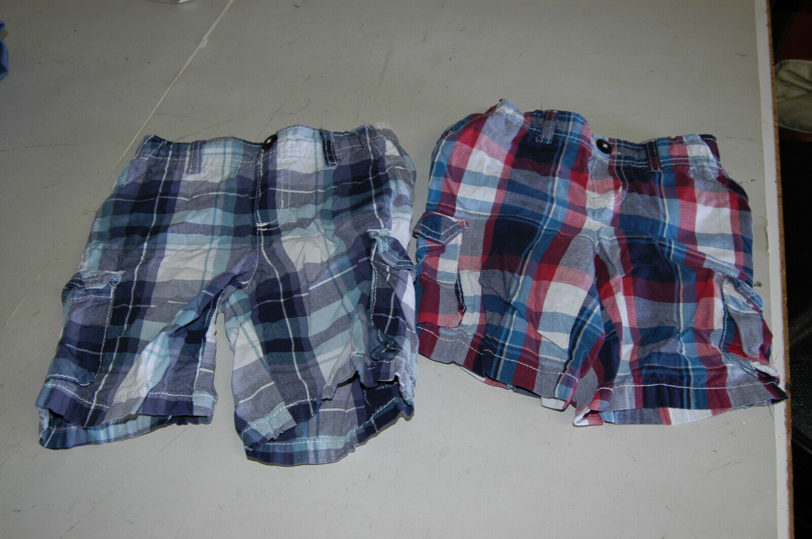 Here are 2 good used pair of boys Sonoma plaid cargo style shorts. Measures 9 inches at the waist laying flat.