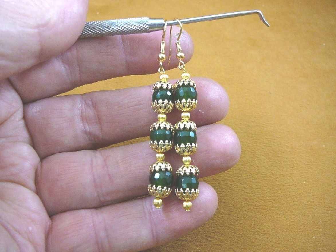 (ee404-61) 8 mm Green Jade Canada gemstone 3 beaded + gold caps dangle earrings