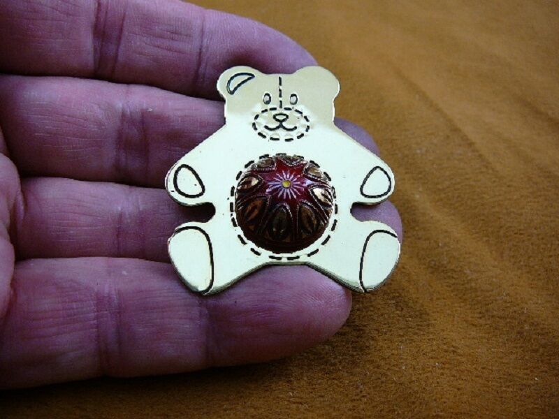 (z22-3) RED star flower design Czech glass button teddy bear brass brooch pin