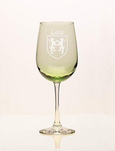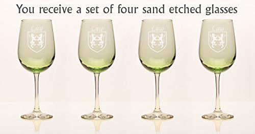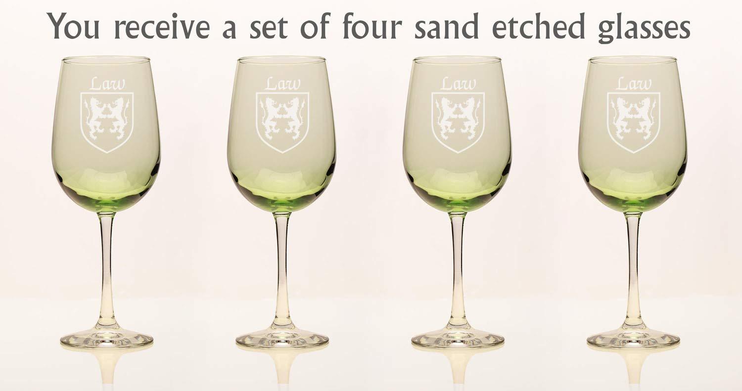 Law Irish Coat of Arms Green Wine Glasses - Set of 4. What occasion couldn't be made more special with a toast? And how special would it be to toast with wine glasses etched with your authentic Irish name and coat of arms, now in our brand new, elegant green color? For your most special occasions, or everyday weekday dinners, choose this durable, well-balanced and elegant wine glass, suitable for white or red. Each Irish coat of arms wine glass is permanently and professionally sand-etched with your surname and family crest. 17 oz. Choose from over 1000 available coat of arms.