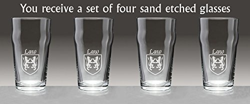 Product description: Law Irish Coat of Arms Pub GlassesMade for comfort, the Pub Glass is less likely to slip out of your hand thanks to the lovely "hip" around the middle. This style of glass is sometimes called a Nonic Pint Glass or Imperial Pint Glass. The final stroke of genius is your Irish family name and coat of arms sand-etched on the side. 20 oz. in size and dishwasher and microwave safe. Choose from over 1200 available family coat of arms. USA. Authentic Irish Family Coat of Arms Over 25 years of Heraldry Research Set of 4 Irish Coat of Arms Pub Glasses (Sand Etched) High quality sand etching with heavy base Each glass holds a large 20 ounces of your favorite beverageShape improves grip strength :)Product Size:Height - 6 inhesBottom Diameter- 2.5 inchesMaximum Diameter - 3.5 inchesTop Diameter - 3.25 inchesCapacity - 20 ounces