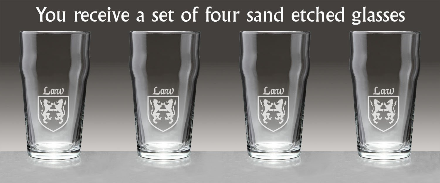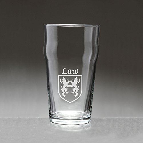 Law Irish Coat of Arms Pub GlassesMade for comfort, the Pub Glass is less likely to slip out of your hand thanks to the lovely "hip" around the middle. This style of glass is sometimes called a Nonic Pint Glass or Imperial Pint Glass. The final stroke of genius is your Irish family name and coat of arms sand-etched on the side. 20 oz. in size and dishwasher and microwave safe. Choose from over 1200 available family coat of arms. USA. Authentic Irish Family Coat of Arms Over 25 years of Heraldry Research Set of 4 Irish Coat of Arms Pub Glasses (Sand Etched) High quality sand etching with heavy base Each glass holds a large 20 ounces of your favorite beverageShape improves grip strength :)Product Size:Height - 6 inhesBottom Diameter- 2.5 inchesMaximum Diameter - 3.5 inchesTop Diameter - 3.25 inchesCapacity - 20 ounces