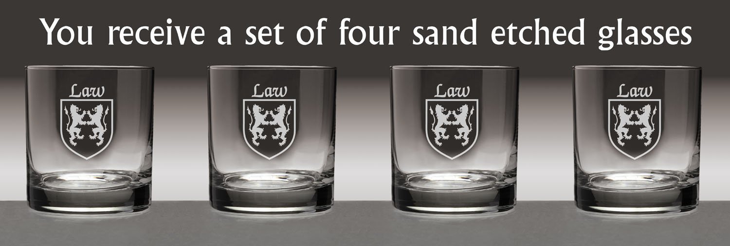 Law Irish Coat of Arms Tumbler Glasses If ye'll be havin' a wee bit of the Jameson whiskey on a cool evening, this will be the glass. Or Scotch, neat. A Cosmopolitan, perhaps. Or just a spot of lemonade, for that matter. Nicely balanced, clean-lined and just plain grown-up, the Tumbler's dignity is heightened by a sand-etched Irish coat of arms and family name. Why not yours? 11 oz. in size and dishwasher safe. Choose from over 1000 available Irish crests. USA.Washing Instructions:Dishwasher and microwave safe. Authentic Irish Family Coat of Arms Over 25 years of Heraldry Research Set of 4 Irish Coat of Arms Tumbler Glasses (Sand Etched) High quality sand etching with extra heavy basepattern:heavy basebottom diameter:3-3/16"maximum diameter:3-1/4"capacity:11 oz product height:3-1/2"