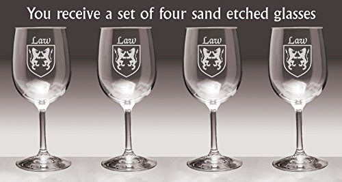 Product description: Law Irish Coat of Arms Wine GlassesWhat occasion couldn't be made more special with a toast? And how special would it be to toast with wine glasses etched with your authentic Irish name and coat of arms? For your most special occasions, or everyday weekday dinners, choose this durable, well-balanced and elegant wine glass, suitable for white or red. Each Irish coat of arms wine glass is permanently and professionaly sand-etched with your surname and family crest. 13 oz. Choose from over 1000 available coat of arms.Washing Instructions:Dishwasher and microwave safe. Authentic Irish Family Coat of Arms Over 25 years of Heraldry Research Set of 4 Irish Coat of Arms Wine Glasses (Sand Etched) High quality sand etching Each glass holds 13 ounces of your favorite Wine+Product height: 7-1/2"Maximum diameter: 3-3/8"Top diameter: 2-7/8"Bottom diameter: 3-1/4"