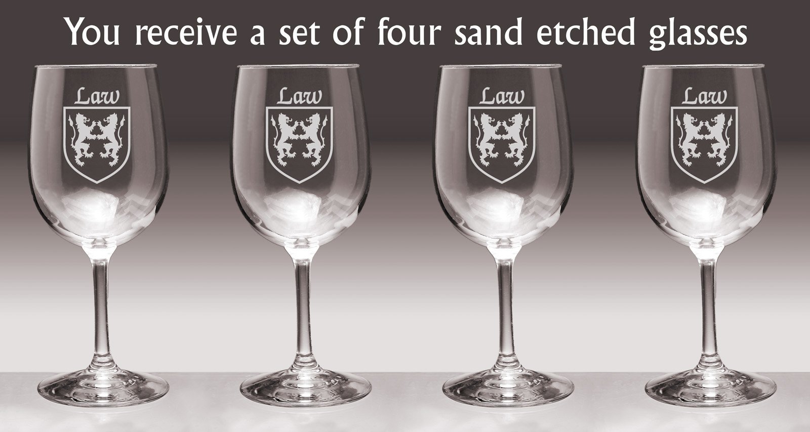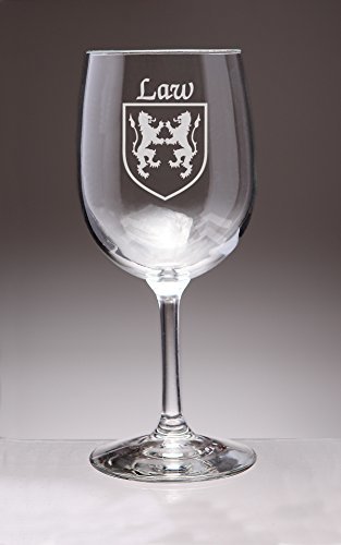 Law Irish Coat of Arms Wine GlassesWhat occasion couldn't be made more special with a toast? And how special would it be to toast with wine glasses etched with your authentic Irish name and coat of arms? For your most special occasions, or everyday weekday dinners, choose this durable, well-balanced and elegant wine glass, suitable for white or red. Each Irish coat of arms wine glass is permanently and professionaly sand-etched with your surname and family crest. 13 oz. Choose from over 1000 available coat of arms.Washing Instructions:Dishwasher and microwave safe. Authentic Irish Family Coat of Arms Over 25 years of Heraldry Research Set of 4 Irish Coat of Arms Wine Glasses (Sand Etched) High quality sand etching Each glass holds 13 ounces of your favorite Wine+Product height: 7-1/2"Maximum diameter: 3-3/8"Top diameter: 2-7/8"Bottom diameter: 3-1/4"
