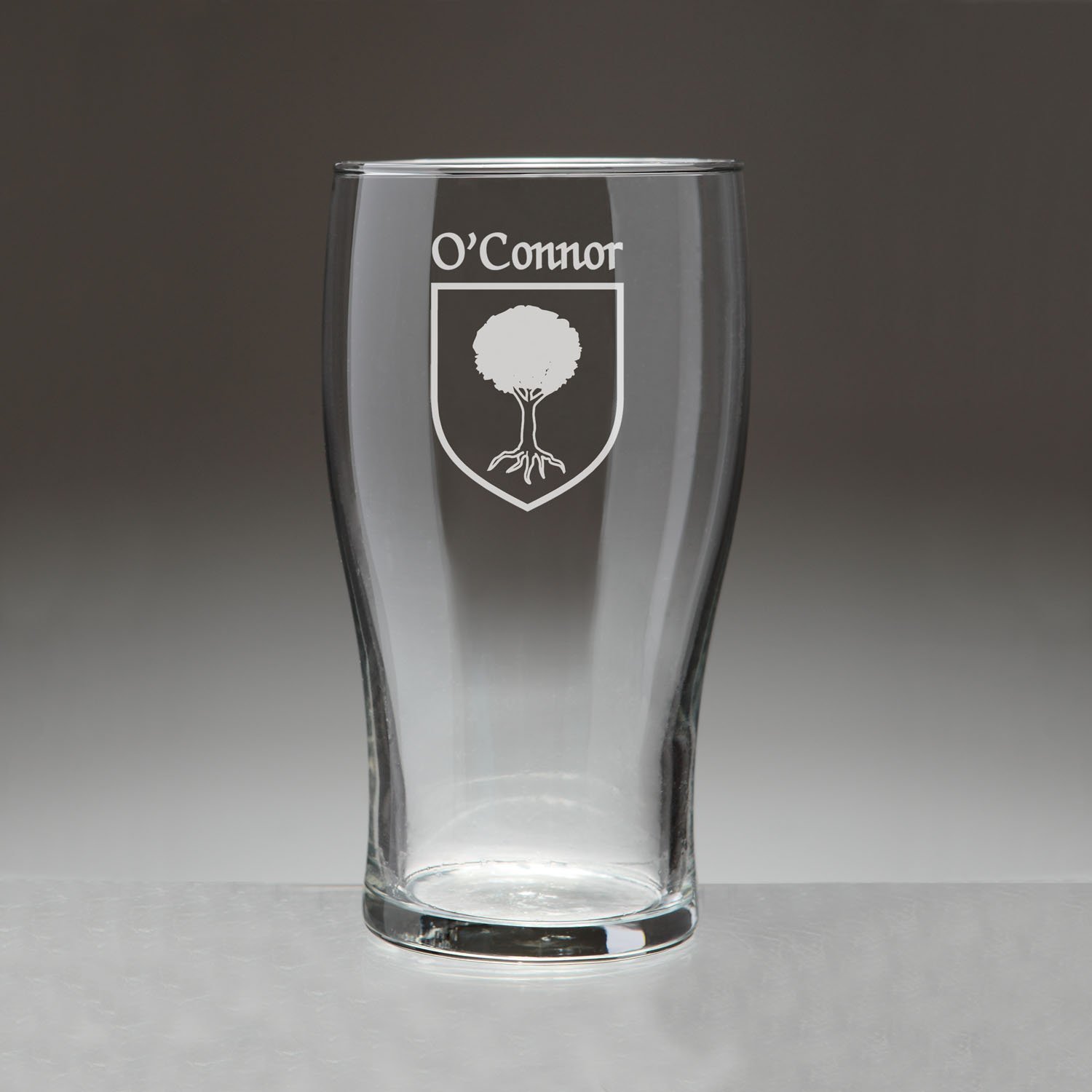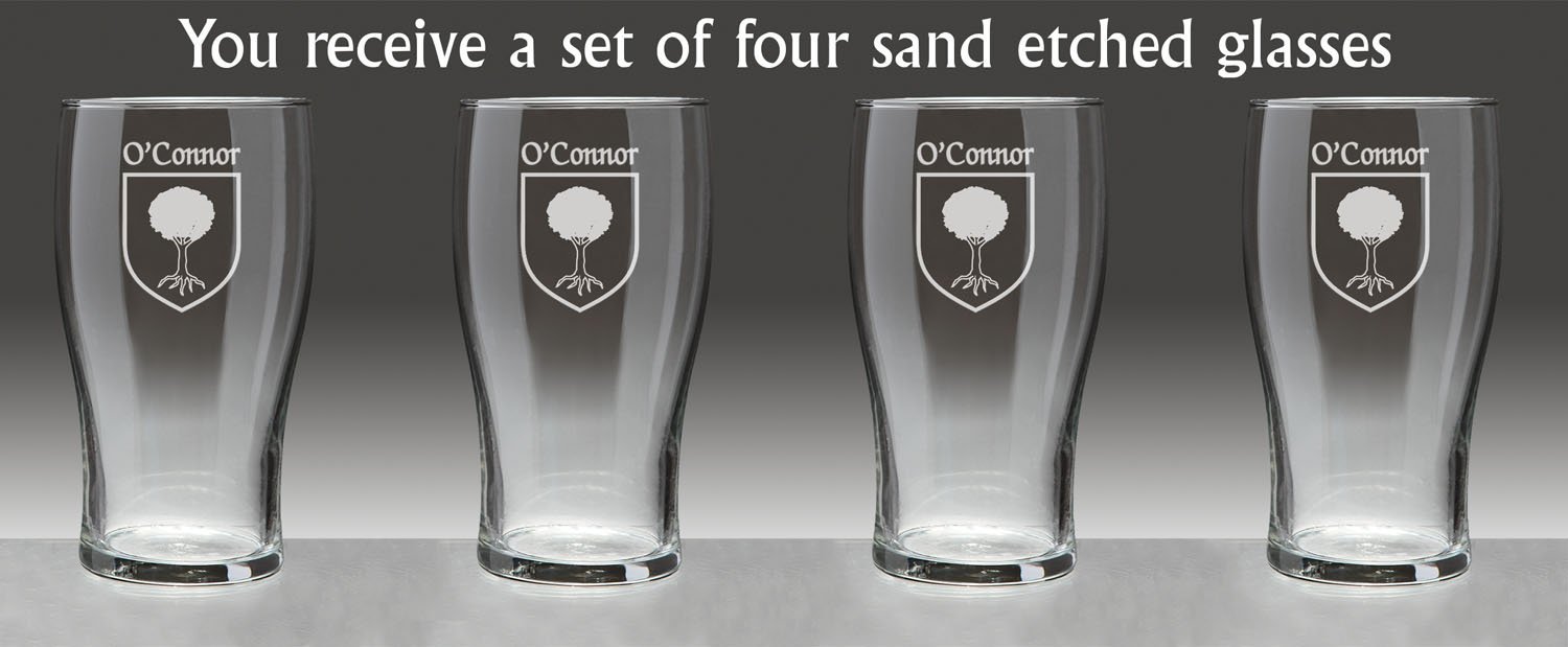 OConnor Irish Coat of Arms Tavern GlassesDanger: Curves ahead! From her hand-sized base to the gentle swell of her keel, this style of glassware is an age-old tradition on oaken bars all over the Celtic isles because of the wonderful balance, weight and durability she brings to the table.An official standard Irish pint at 20 oz., the Coat of Arms Tavern Glass features your permanently sand-etched Irish family coat of arms. Microwave and dishwasher safe.Choose from over 1200 available family Irish crests. Authentic Irish Family Coat of Arms Over 25 years of Heraldry Research Set of 4 Irish Coat of Arms Tavern Glasses (Sand Etched) High quality sand etchingEach glass holds 20 ounces of your favorite beverage
