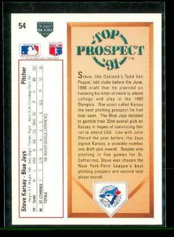 Vintage 1990 UPPER DECK TOP PROSPECT Baseball Card #54 STEVE KARSAY Toronto Blue Jays