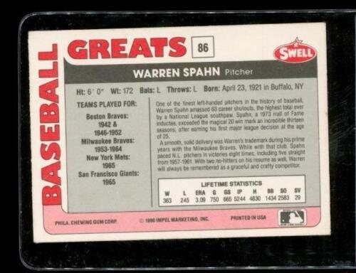 Vintage 1990 PHILADELPHIA CHEWING GUM CORPORATION SWELL BASEBALL GREATS Baseball Card #86 WARREN SPAHN Milwaukee Braves