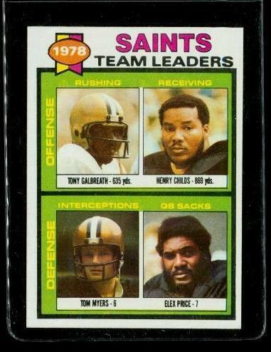 Vintage 1979 TOPPS LEADERS Football Card #451 TEAM CHECKLIST - TONY GALBREATH, HENRY CHILDS, TOM MYERS, ELEX PRINCE New Orleans Saints