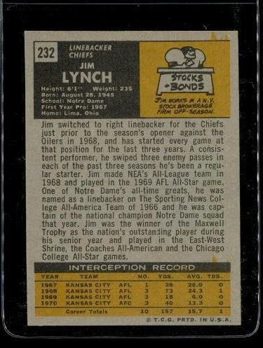 Vintage 1971 TOPPS TCG Football Trading Card #232 JIM LYNCH Kansas City Chiefs