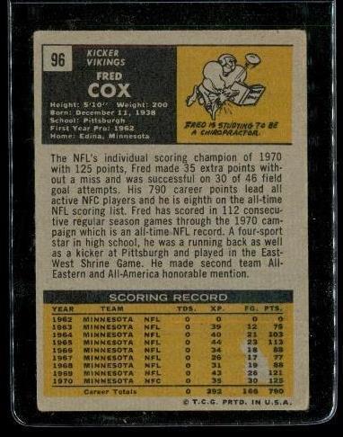 Vintage 1971 TOPPS TCG ALL-STAR Football Trading Card #96 FRED COX Minnesota Vikings