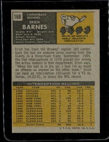 Vintage 1971 TOPPS TCG Football Trading Card #168 ERICH BARNES Cleveland Browns