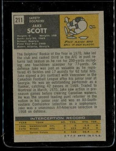 Vintage 1971 TOPPS TCG Football Trading Card #211 JAKE SCOTT Miami Dolphins