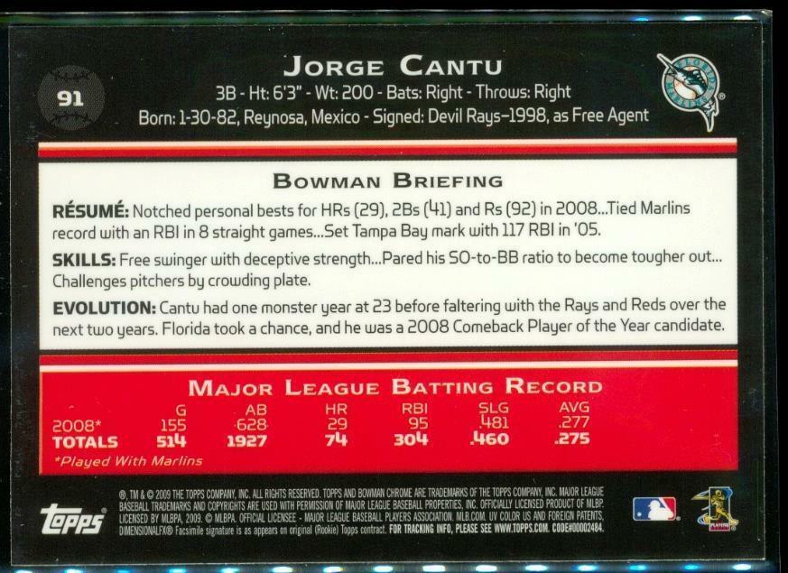 2009 Baseball Card TOPPS Bowman Chrome #91 JORGE CANTU Florida Marlins - 3rd Base