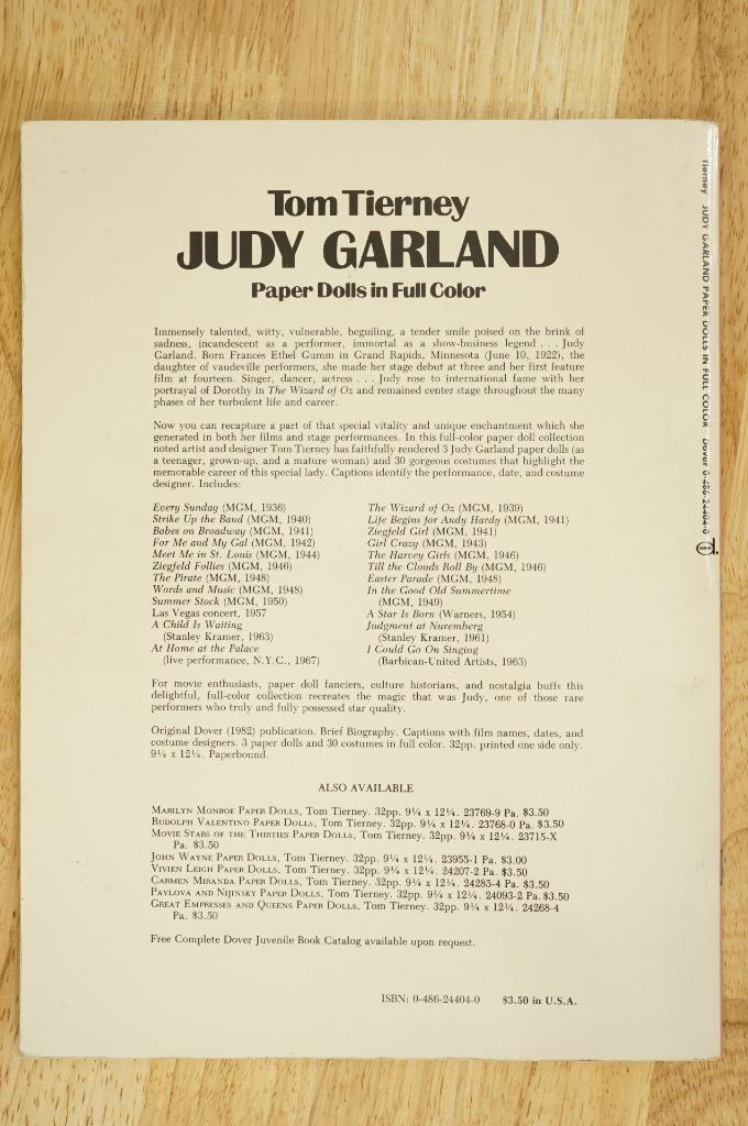 Vintage Toy Paper Dolls Book JUDY GARLAND Movie Costumes by Tom Tierney 1982. Clean and uncut. No smoke or pet odors. Direct from a local estate.