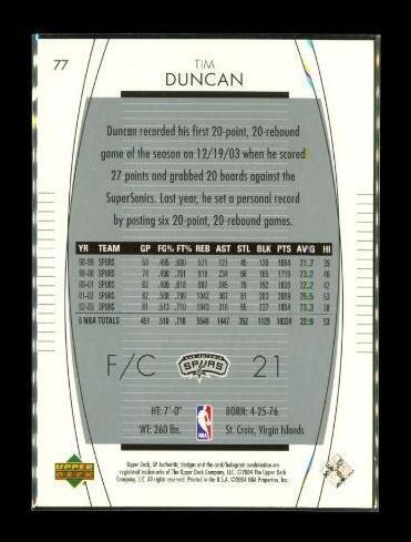 2003-04 UPPER DECK SP AUTHENTIC Basketball Card #77 TIM DUNCAN San Antonio Spurs