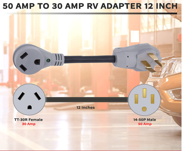 50 Amp to 30 Amp Power Adapter - This power adapter converts electrical power received by an RV from a power source and provides reliable conductivity. A 12" length cord with 14-50P male and TT-30R female adapter that allows a 30A RV cord to be plugged into a 50A receptacle in a power pedestal for a stable transmission of power and to protect wirings at any campgrounds. This is applicable to your travel trailers, caravan, motorhome and campers recreational vehicles.