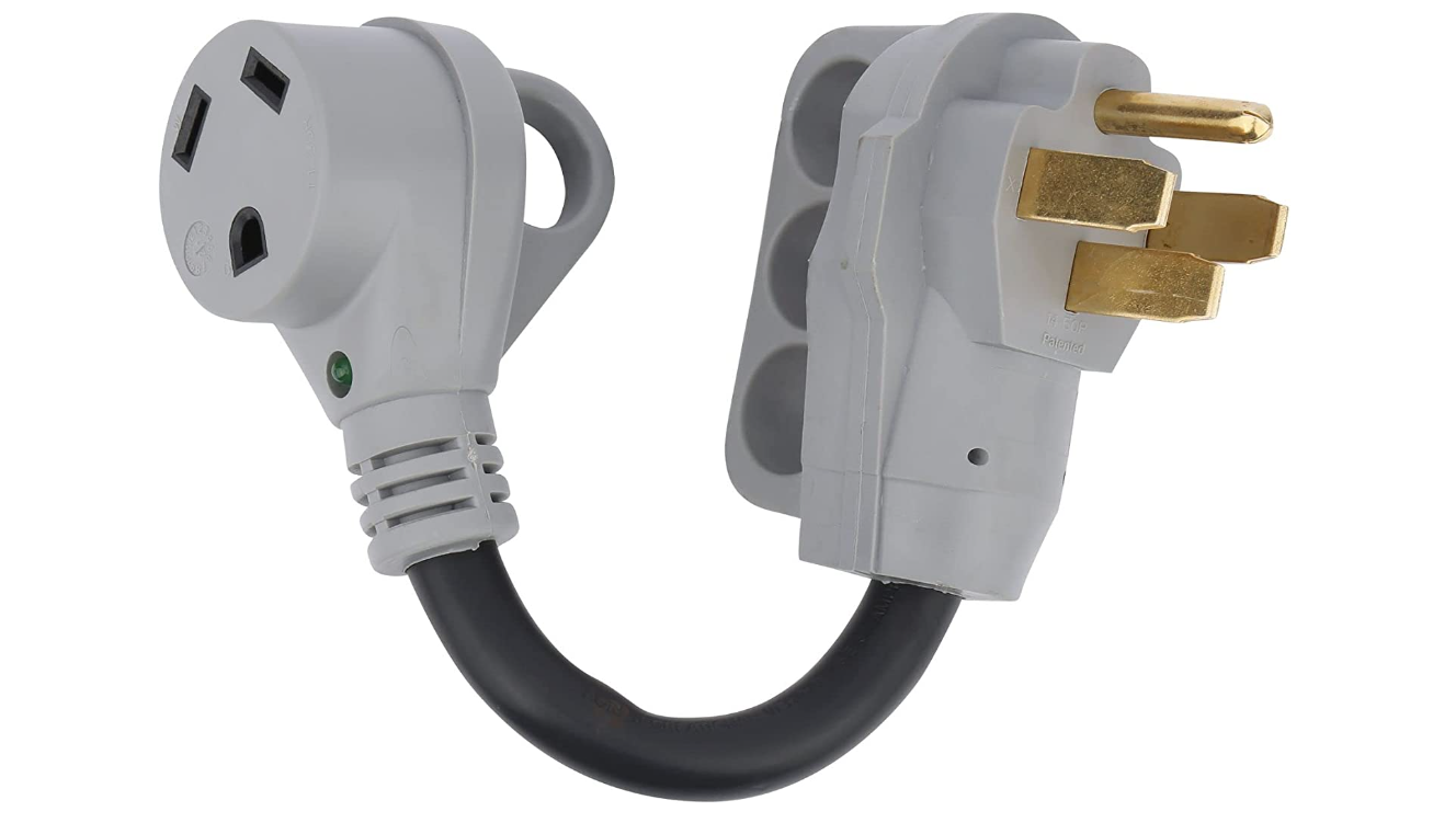 12" RV Electrical Adapter Plug - This electrical converter cord is a heavy duty 10/3 STW, made of premium wire material of 100% copper, covered with heavy duty flame-proof and heat-resistant PVC cord and is tested for outdoor use. A 12 inch length cord, perfect for external receptacle at any camping grounds.