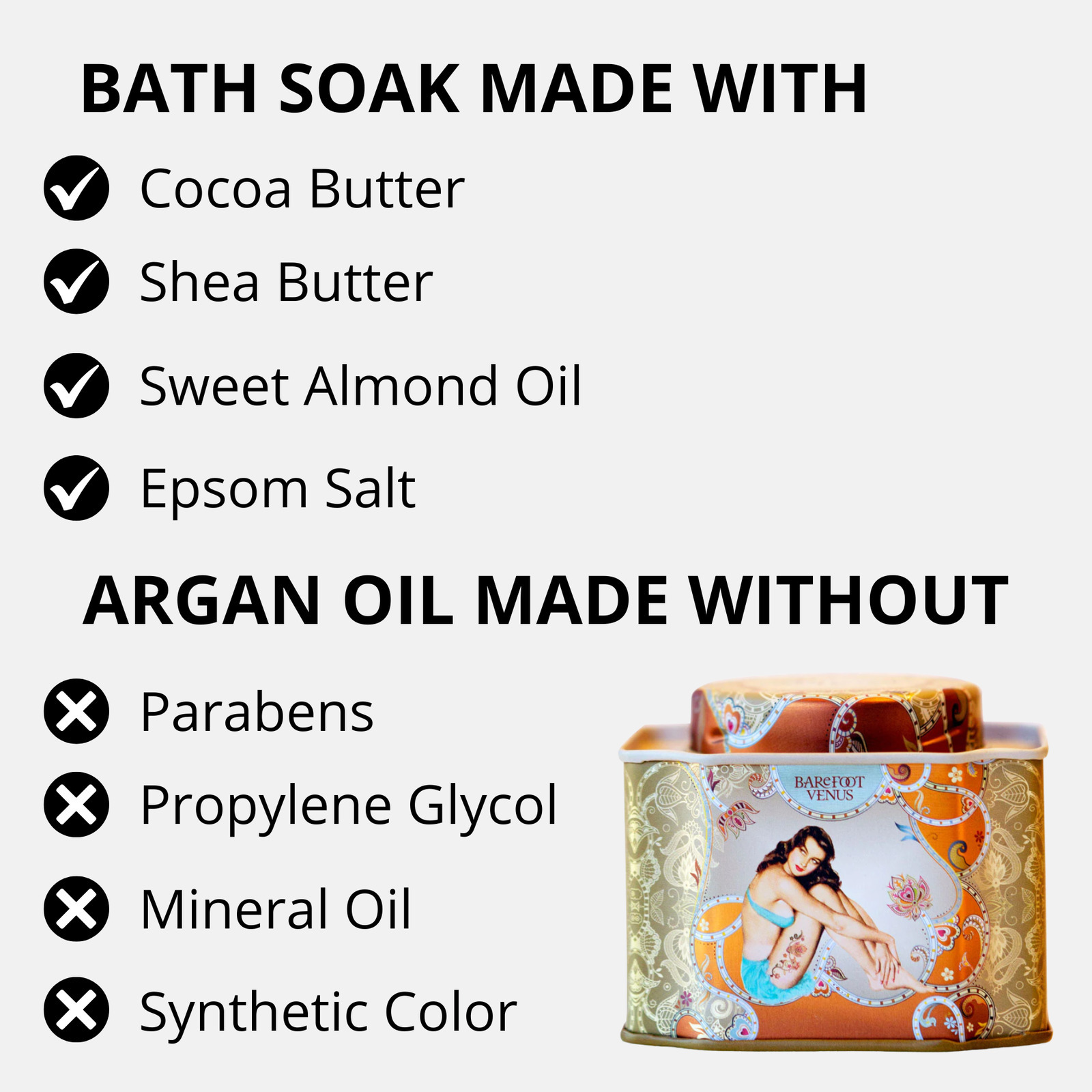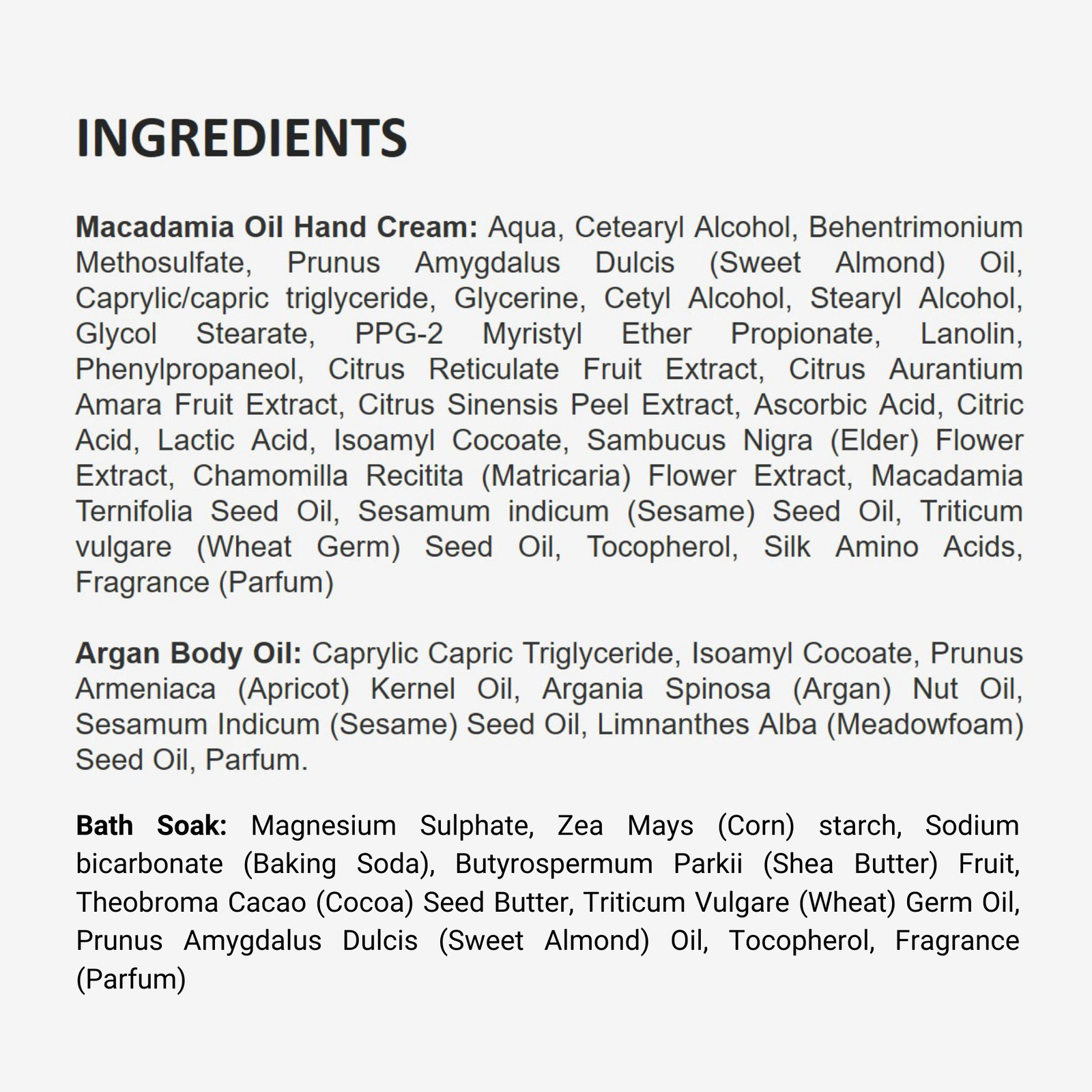 Package includes: 7oz Bath Soak, 4oz Argan Body Oil, and 1.7oz Macadamia Oil Hand Cream. Made In Canada.