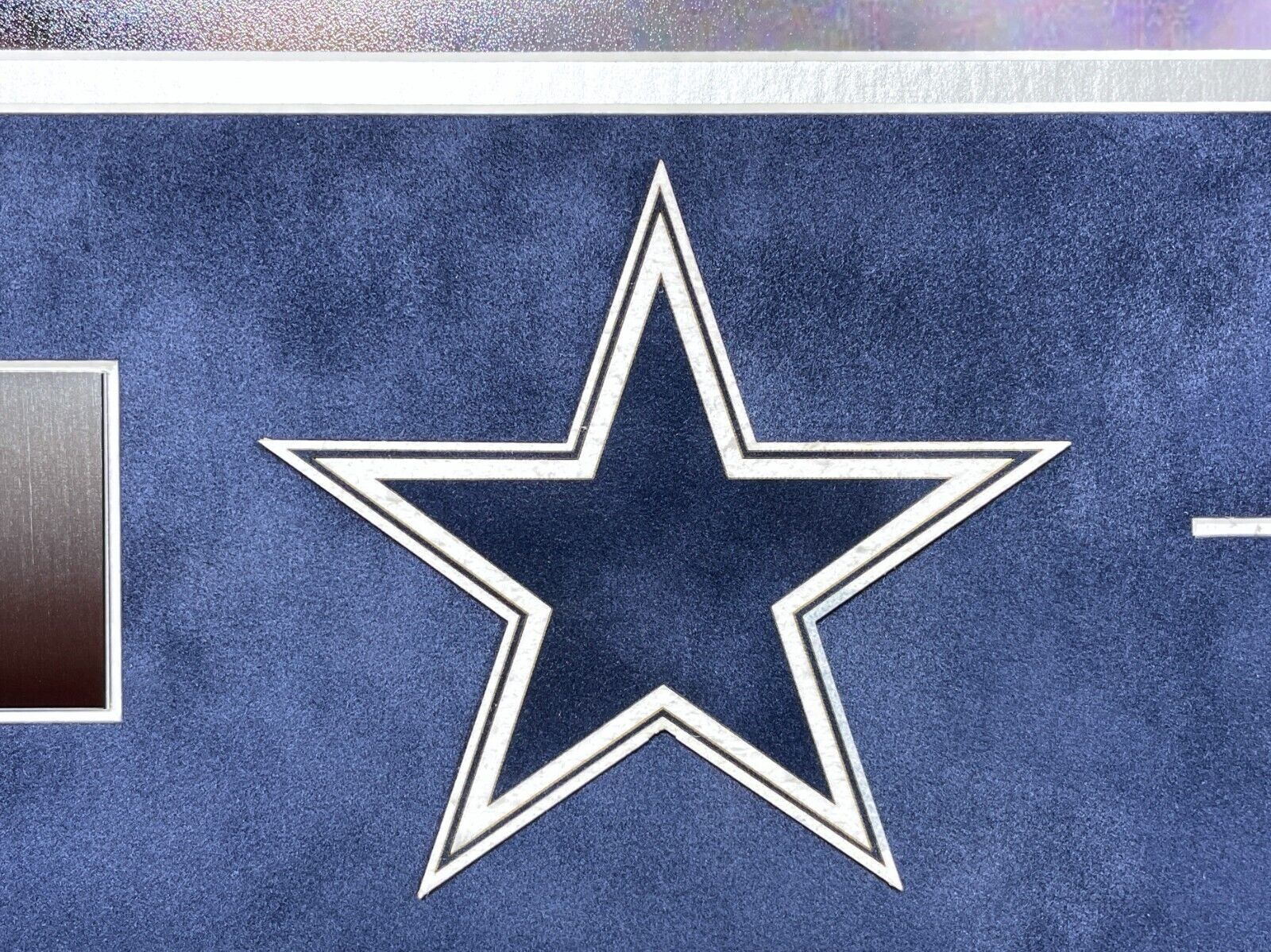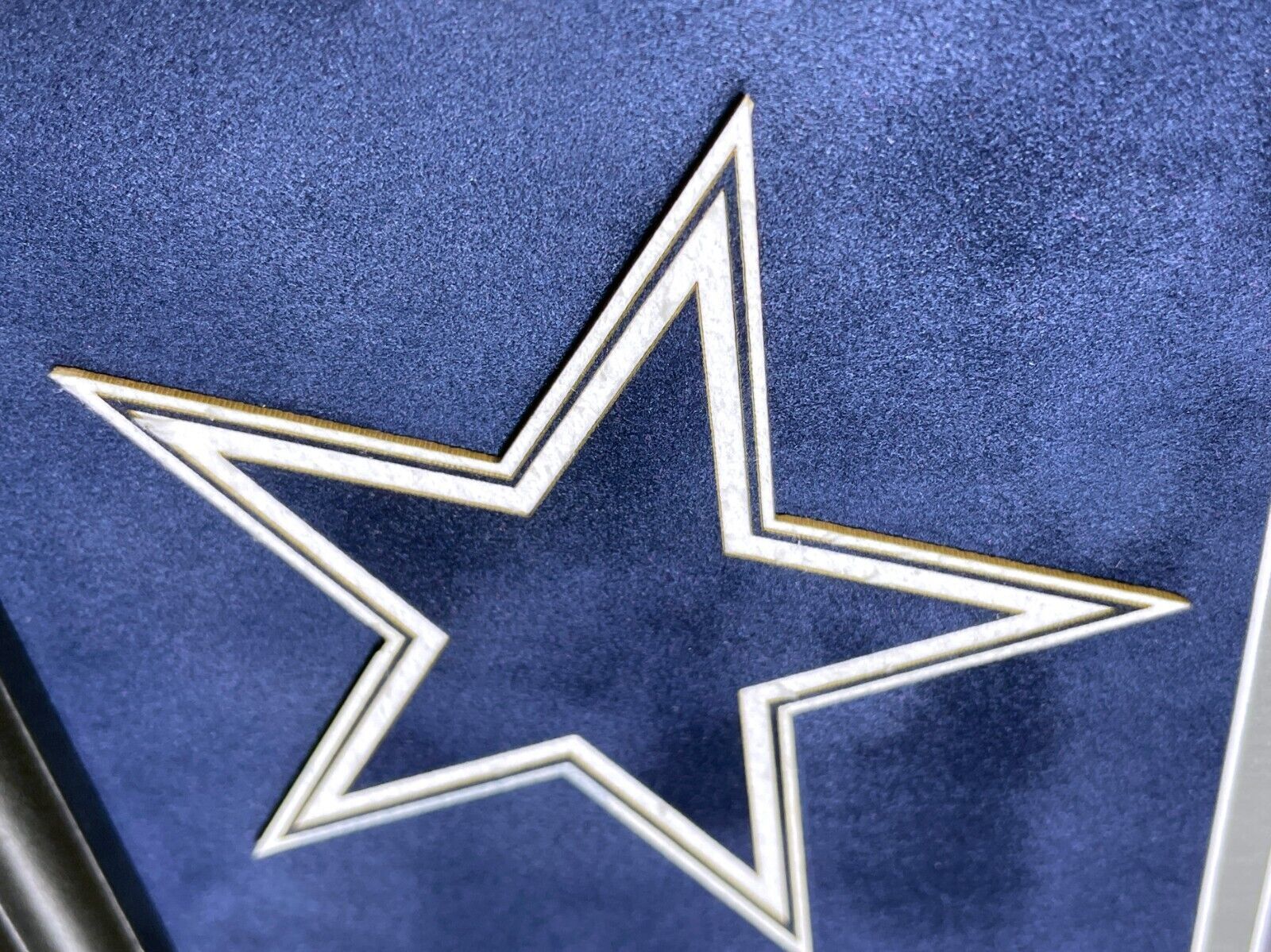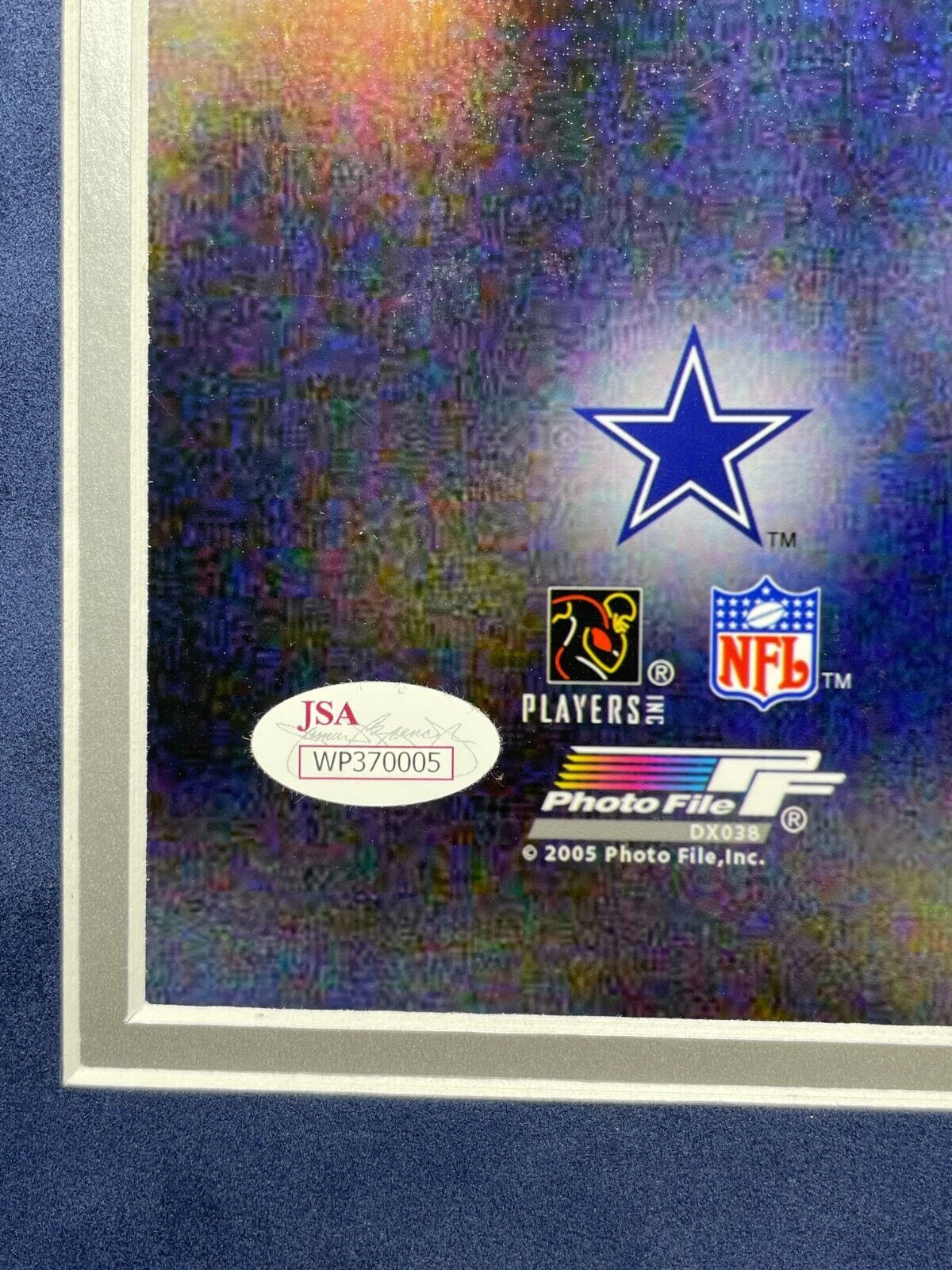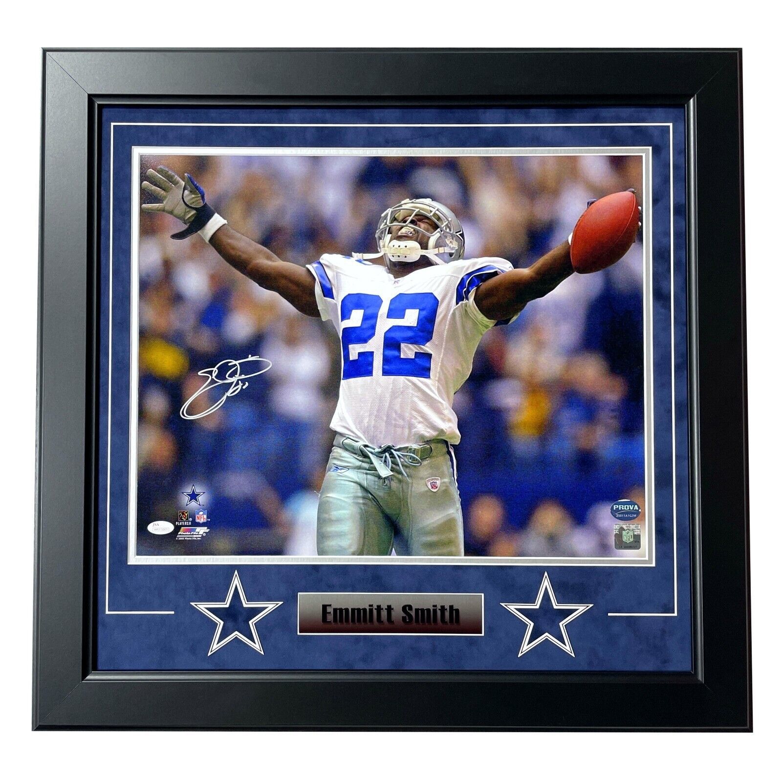 Dallas Cowboys Fans!! Looking for that next great item to add to your memorabilia collection? Well, this is it! Emmitt Smith Autographed 16" x 20" Photo Collage! This iconic photo is from when Emmitt broke Walter Payton's career all time rushing yards record on October 27, 2002, against the Seahawks. Emmitt through his arms up on the field like you see in this photo right after this monumental NFL moment. This is a must-have item for all Cowboys fans' man caves, game rooms, lady lairs and offices! If you are looking for a high-end signed piece to display on your wall, then look no further. This piece comes professionally museum quality custom framed with double matting with a black suede top mat, laser cut suede team logos and a metal nameplate! In addition, the piece measures approximately 27" x 26" x 1" in size in a black frame with a plexiglass display. As soon as you open the box on your doorstep, your piece is ready to hang on the wall. The custom frame workmanship on this piece is second to none in the industry, and this type of quality is very difficult to find. Certificate of Authenticity: This item has been double certified as AUTHENTIC. It has been certified by a James Spence Authentication (JSA), one of the sports memorabilia industry's most trusted amp; reputable authentication companies in the business today. This item can be verified directly through their online authentication database found on their website 24/7/365. In addition. Emmitt has his very own memorabilia authentication company known as Prova Group. This item has a Prova Group tamperproof authentication hologram close to the Beckett hologram, which too can be verified on their online authentication database. Prova Group is the very best authentication that you can get for an Emmitt Smith autograph, so you get the 2 best top-notch authentication companies with this incredible item! Note: This is a stock item where we are showing you a generic image of the autographed item mentioned, although it may or may not be the exact one you will receive. The autograph quality may vary from the photo pictured, as well as the location of the autograph.