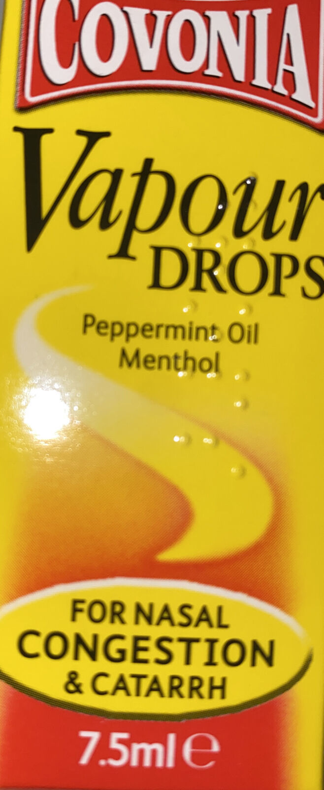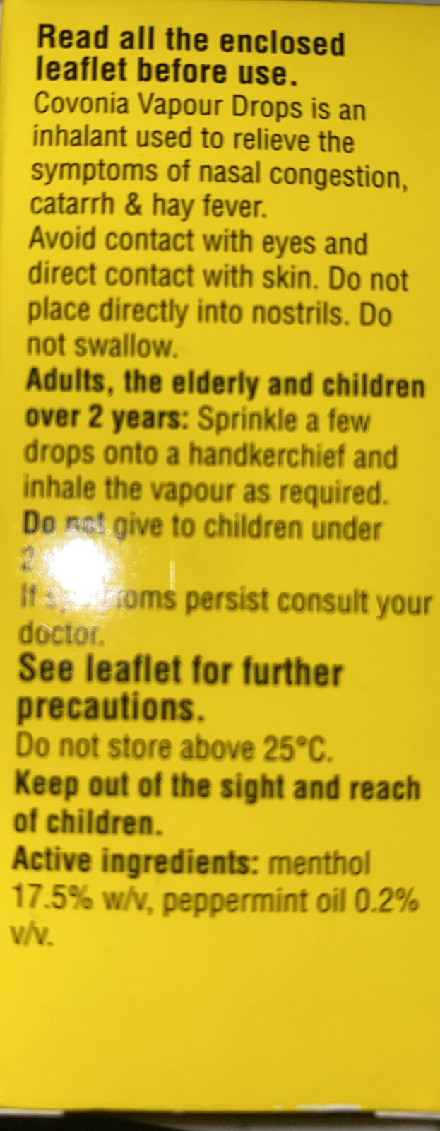 Covonia Vapour Drops Peppermint Oil Menthol Nasal Congestion Catarrh 7.5ml.