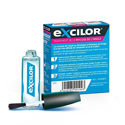 Product description: Excilor treatment for nail mycosis solution 3.3ml is a treatment for nail mycosis, penetrating in the nail.the nail mycosis always growths inside of the nail: consequently, it is often difficult to treat a mycosis.excilor acts according 3 princips:- it penetrates in the nail to reach the mycosis and to facilitate a healthy and immediate regrowth of the nail,- it modifies the ph inside of the nail in order to create an unfavorable environment for the development of dermatophytes,- it is easy to apply and lets an invisible film.it is important to start the treatment during the first days of symptoms: the treatment will be shorter and the nail will rapidly recover its initial aspect. Excilor brings visible results from regrowth of the nail.