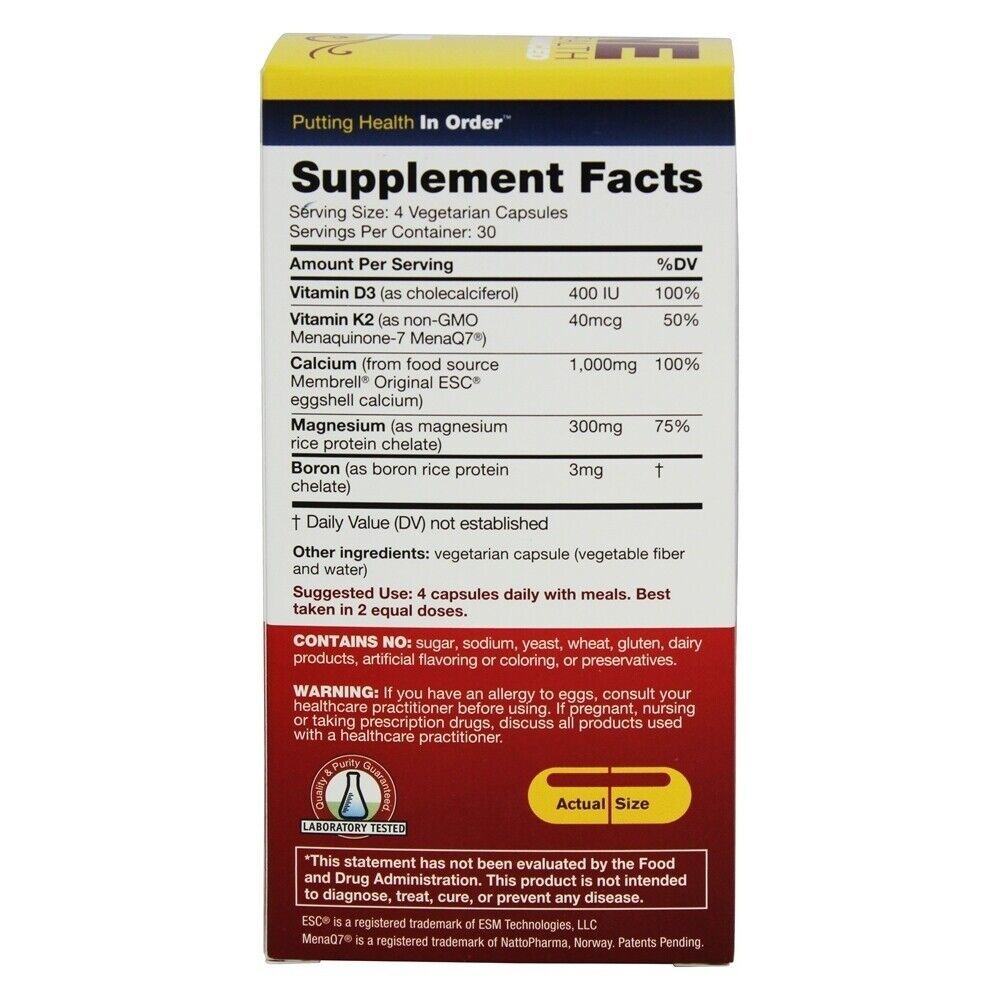 Vitamin D3 (as cholecalciferol)Vitamin K2 (as non-GMO Menaquinone-7 MenaQ7)40mcgCalcium (from food source Membrell Original ESC eggshell calcium)Magnesium (as magnesium rice protein chelate)Boron (as boron rice protein chelate)3mg.Ingredients: vegetarian capsule (vegetable fiber and water)