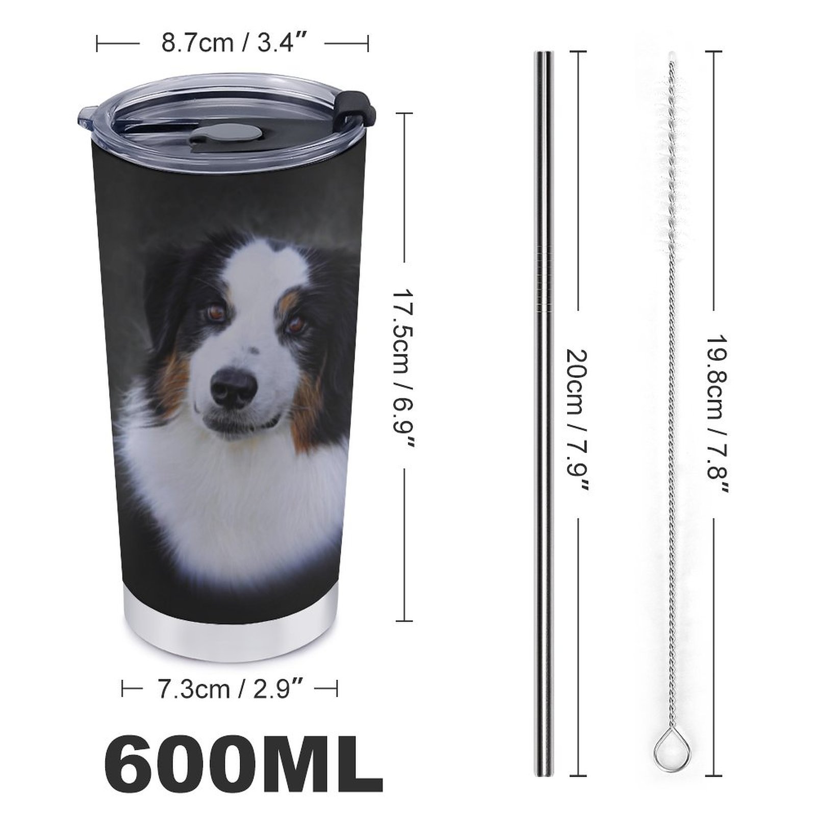 CM: 17.5 x 7.3down x 8.7 top, straw: 20cm.
