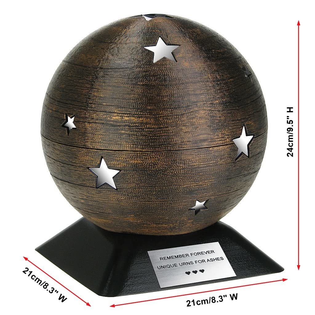 Urn for ashes, consisting of a stainless steel spherel inside and an outer shell of ABS. You can add a memorial plaque with your own text to each urn. The ashes are poured into the urn from the bottom, through a screwed hole. The whole urn is hand painted and decorated with silver stars.
