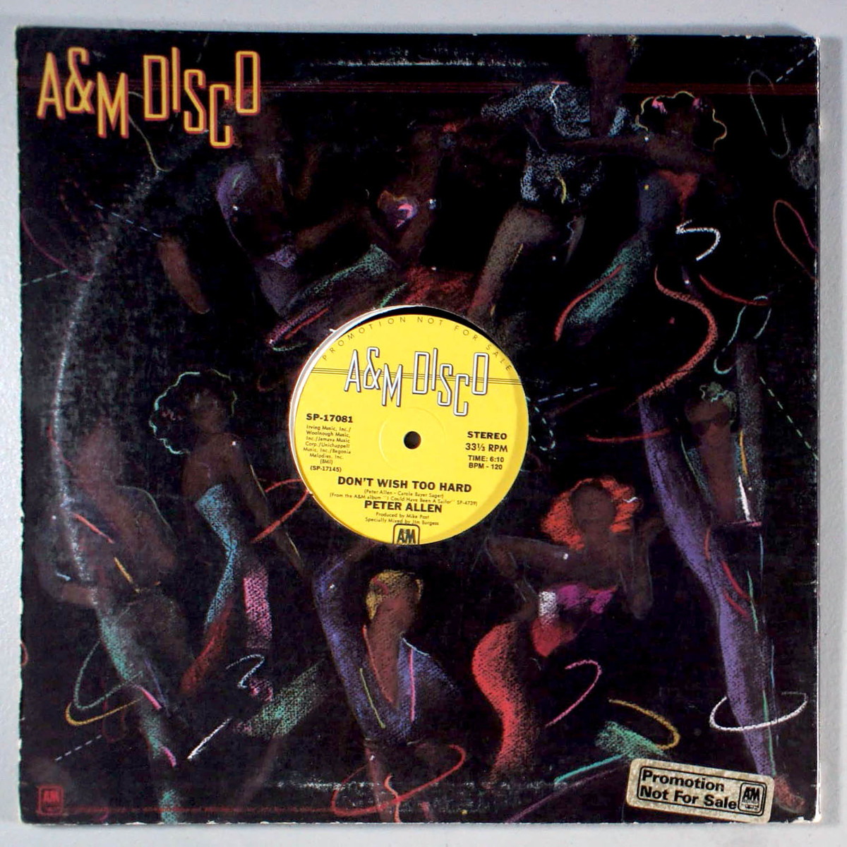 PROMO text on label and sticker on back. HYPE-STICKER on front. Vinyl plays with occasional light-crackles (play-graded). 12" Single. Generic "A M Disco" cover looks good, a few creases near edges; moderate scuffing, surface impressions and abrasions (front/back). Inner-sleeve is original (generic white). Spine is somewhat readable with wear. Little shelf-wear along top/bottom-edge and corners. Opening is crisp with signs of use, tiny tears and divots. BPM ("120") written on one side of label. (Not a cut-out.)