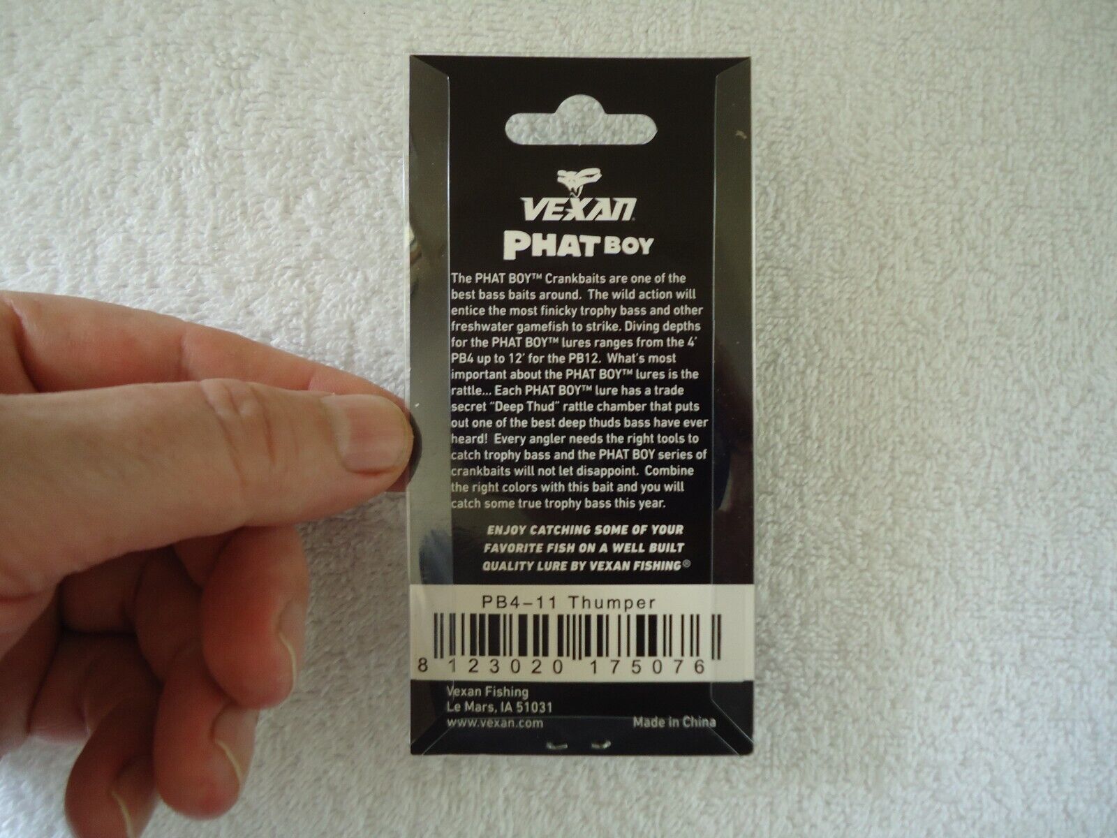 Here is a " NIP " Vexan Phatboy 1/2 oz # PB4-11 Thumper Crankbait " GREAT GIFT ITEM ".The pics do not do this item(s) justice.If you have any concerns or questions about this item(s) please ask before bidding / purchasing because this item(s) is being SOLD AS IS.Thank You.-(PC98)