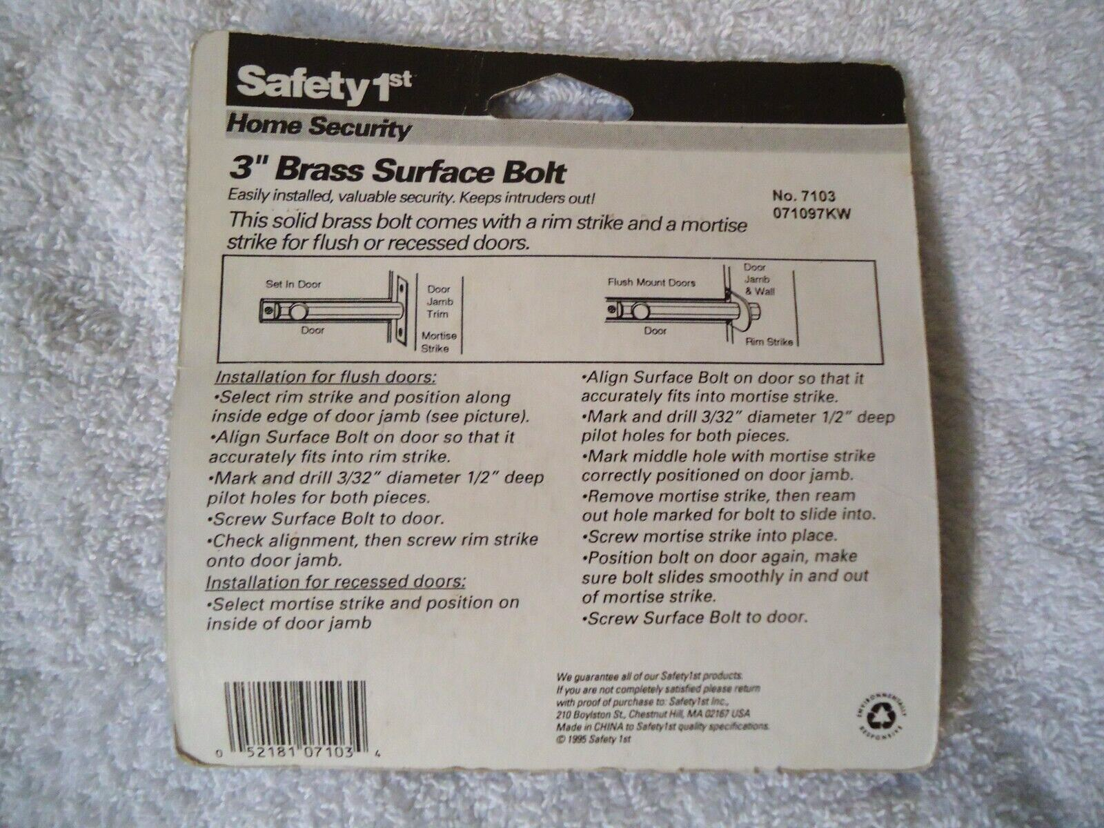 Here is a " NIP " Safety 1st Home Security 3" Brass Surface Bolt " GREAT ITEM ".This is a must for anyone who needs this or a shop for stock.If you have any concerns or questions about this item(s) please ask before bidding / purchasing because this item(s) is being SOLD AS IS.Thank You.-(PC24)