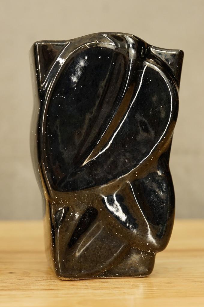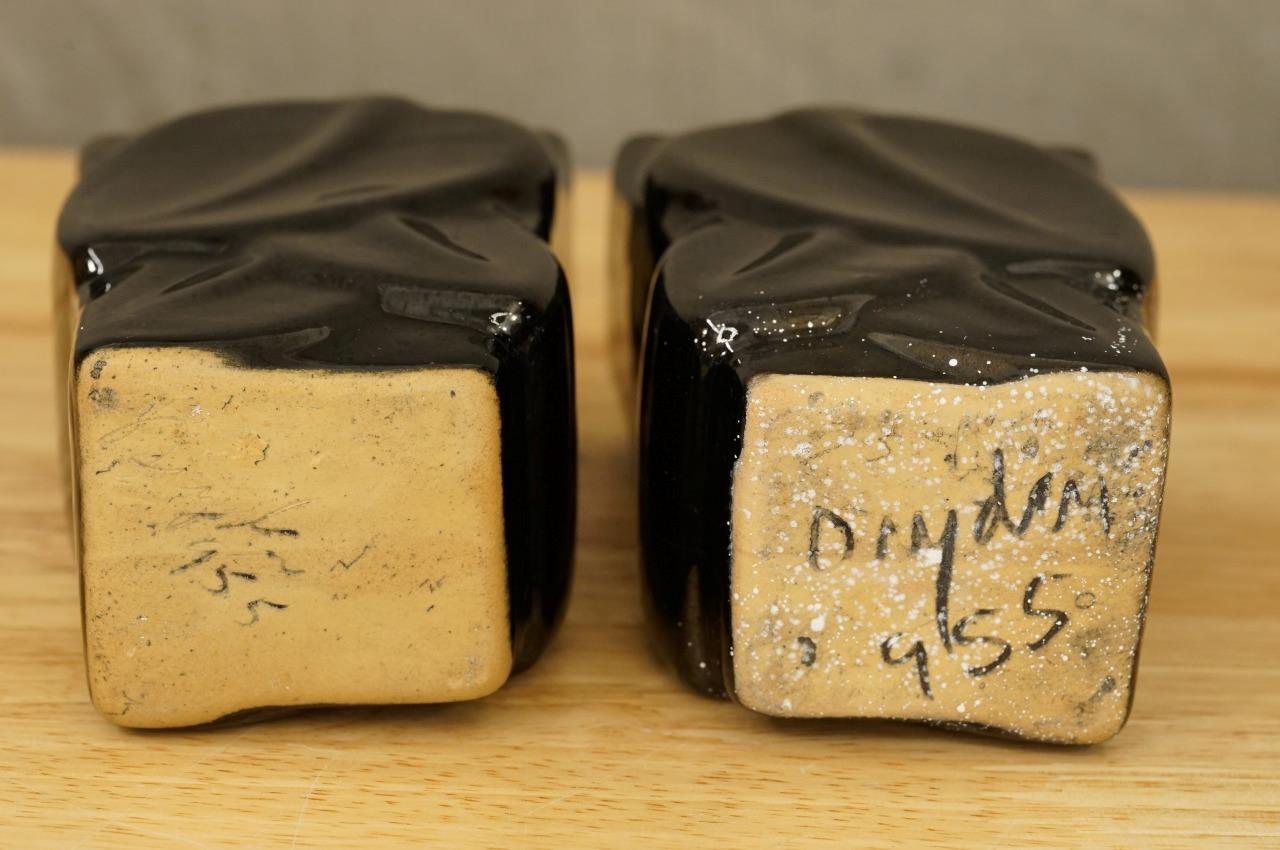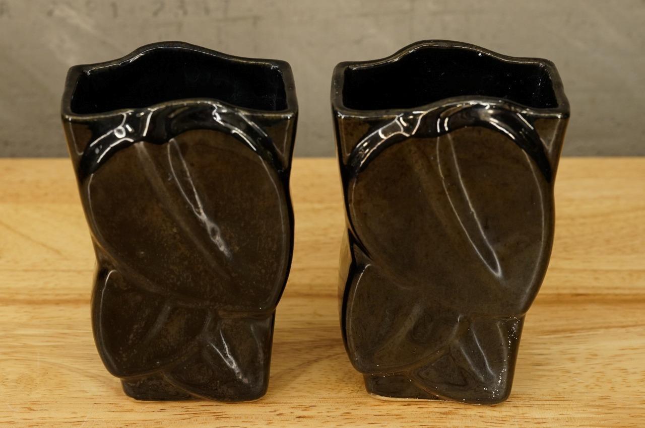 Vintage MCM Mid Century Modern DRYDEN Pottery 955 Pair Black Leaf Flower Vases. No chips or cracks. Smoke and pet free. They measure 5.5" tall. One has tiny white flecks on top of the black glaze. Look like a fine paint splatter. They are signed on the base. No chips or cracks.